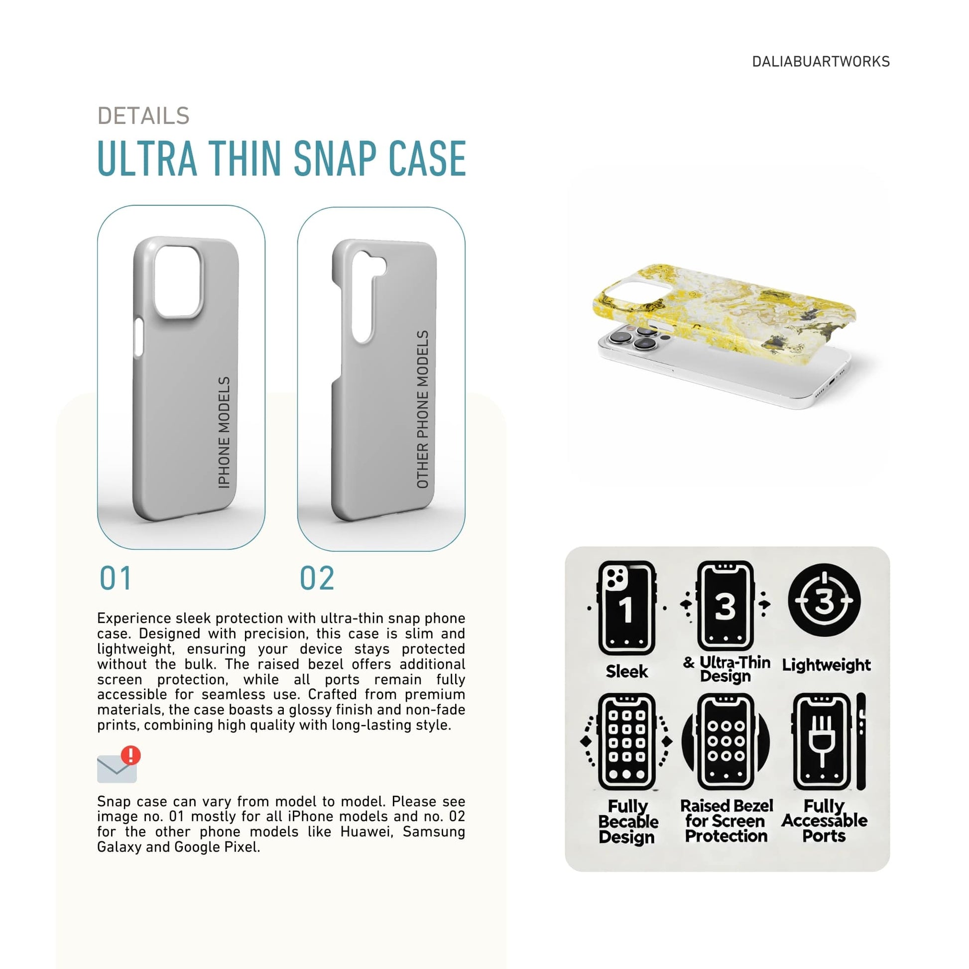 This ultra-thin, slim snap case combines sleek design with tough protection. Made from durable polycarbonate, it fits your phone like a glove, shielding it against scratches, dust, oil, and dirt while remaining lightweight and 100% eye-catching. Its smooth yet resilient construction makes it comfortable to hold, with precise cutouts for ports, volume controls, and essential buttons, ensuring easy access without compromising style or function.