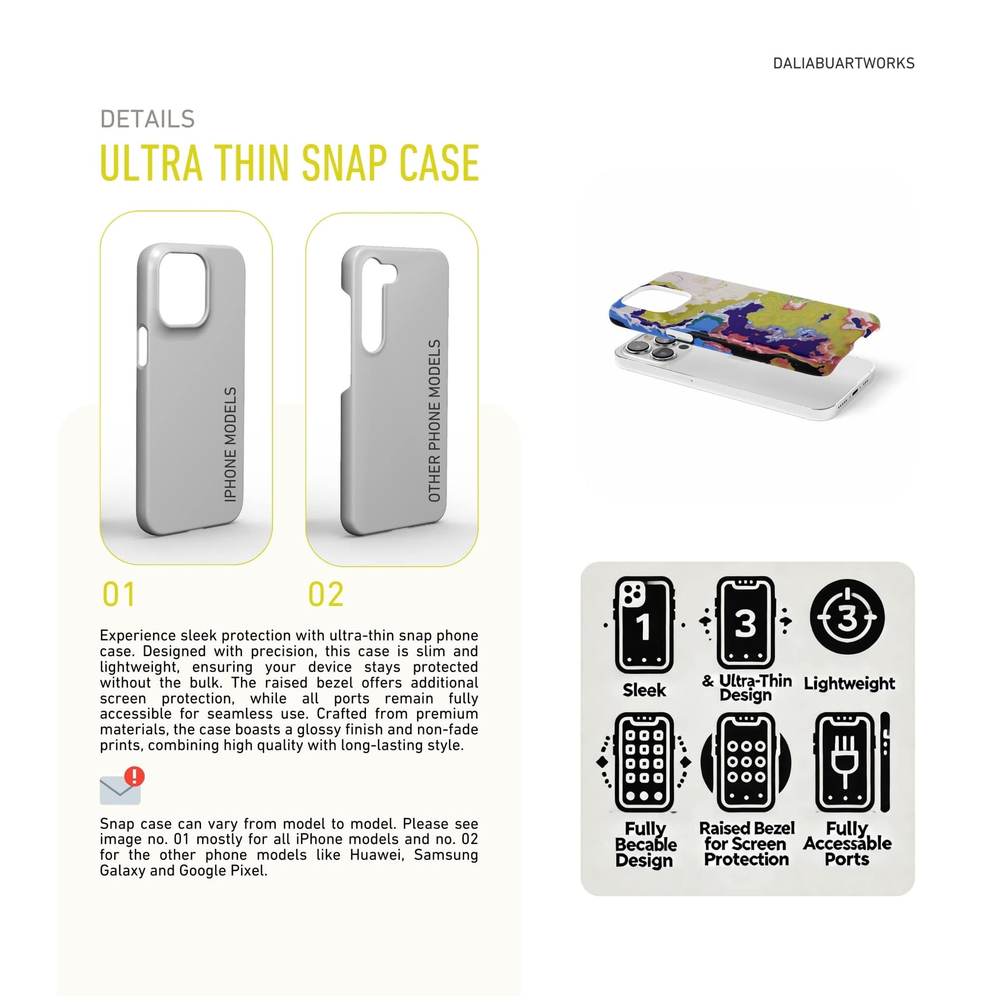 This ultra-thin, slim snap case combines sleek design with tough protection. Made from durable polycarbonate, it fits your phone like a glove, shielding it against scratches, dust, oil, and dirt while remaining lightweight and 100% eye-catching. Its smooth yet resilient construction makes it comfortable to hold, with precise cutouts for ports, volume controls, and essential buttons, ensuring easy access without compromising style or function.