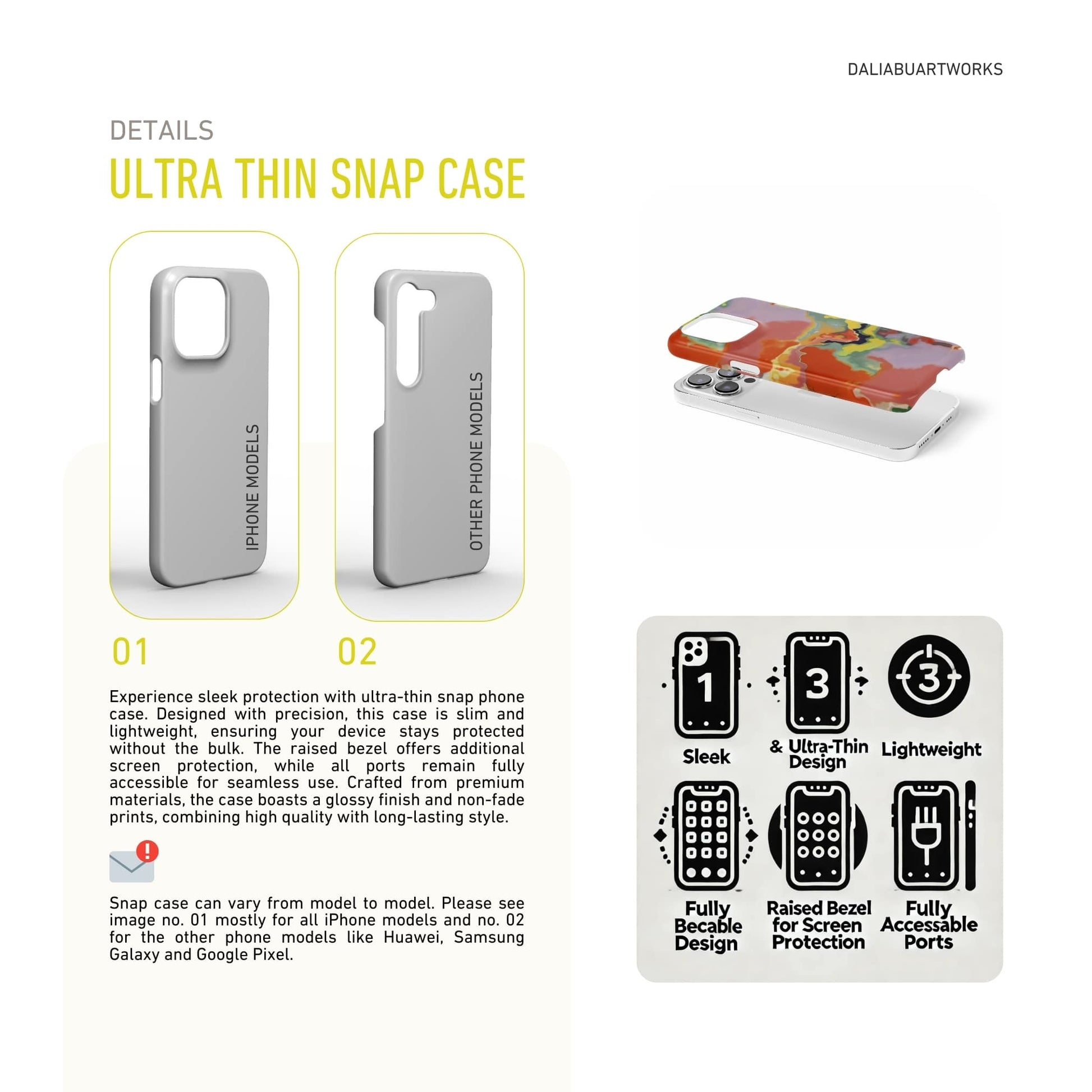 This ultra-thin, slim snap case combines sleek design with tough protection. Made from durable polycarbonate, it fits your phone like a glove, shielding it against scratches, dust, oil, and dirt while remaining lightweight and 100% eye-catching. Its smooth yet resilient construction makes it comfortable to hold, with precise cutouts for ports, volume controls, and essential buttons, ensuring easy access without compromising style or function.